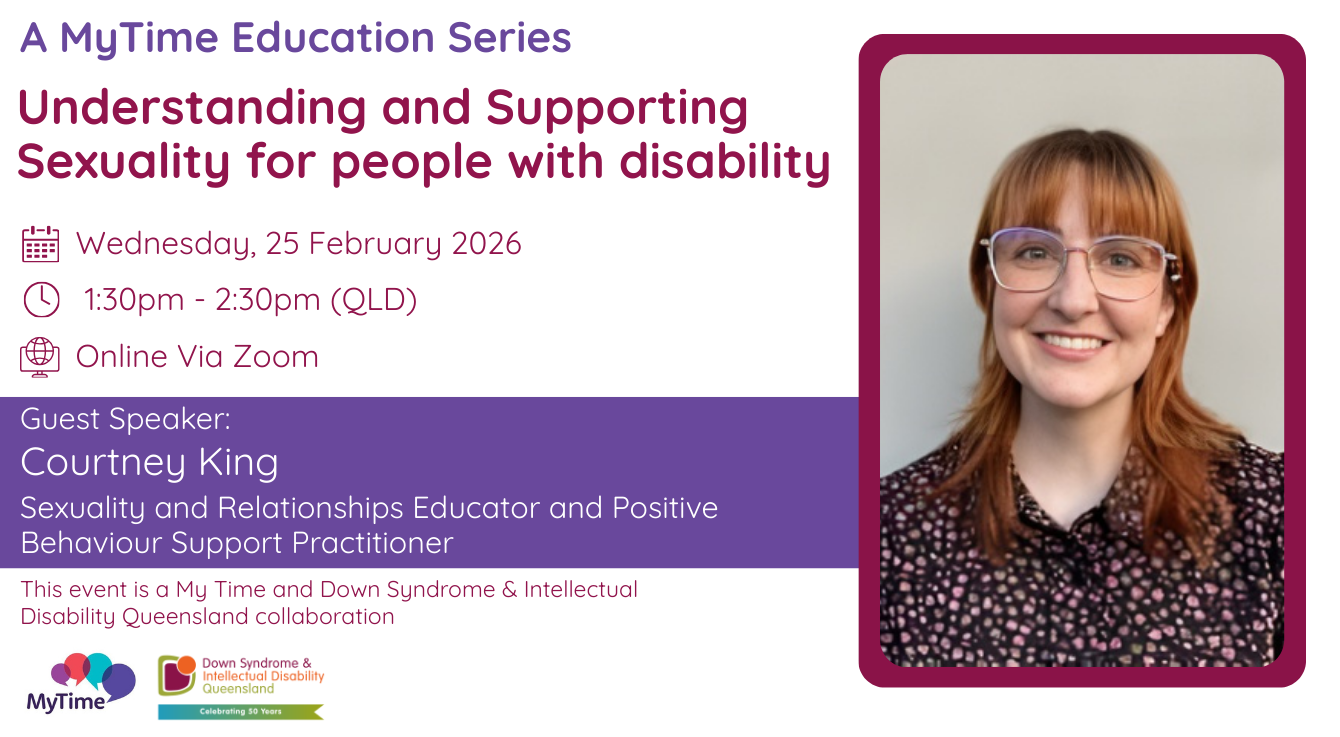 Join DSIDQ’s MyTime Education Webinar Series, featuring expert guest speakers sharing essential, trusted information for families and carers supporting people with intellectual disability. Designed to inform, empower and build confidence across all life stages.